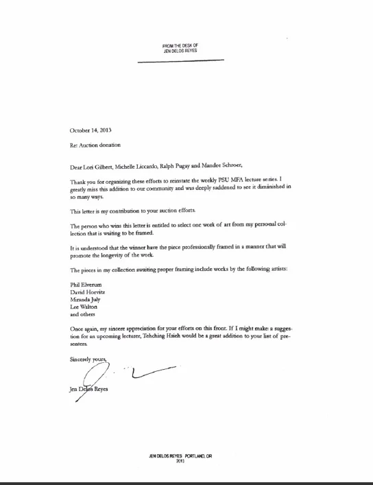 The above letter served as my contribution to the Portland State University MFA Lecture Series Auction. The piece was won by Bruce Conkel.